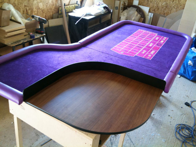 All tables have a good quality contract padded vinyl on the armrest and they all come with a custom printed casino quality cloth from world renowned Martin Williams Casino Cloth. Legs are commonly finished in mahogany lacquered veneer but depending on budget they can be made from solid sapele mahogany.